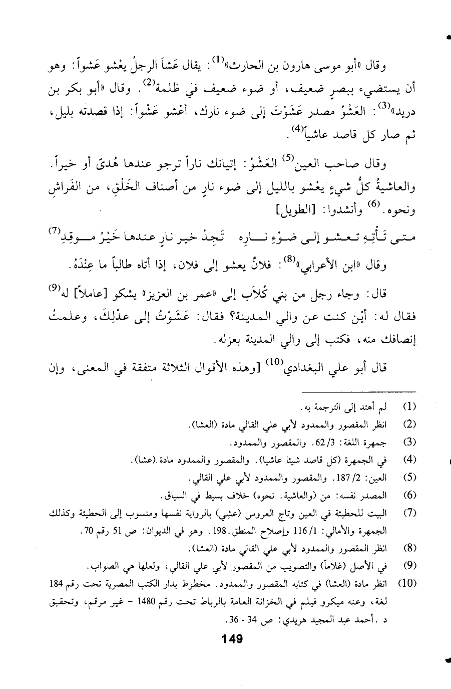 وقال أبو موسى هارون بن الحارث: يقال عَشاَ الرجلُ يعْشو عَشواً: وهو أن يستضيء ببصرٍ