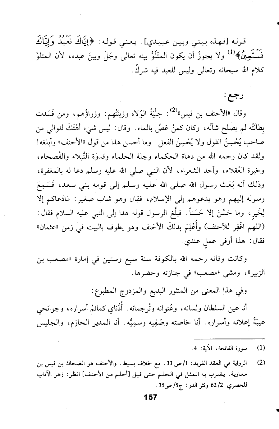 أحسن هذا من قول الأحنف وأبلغه! ولقد كان رحمه الله من دهاة الحكماء وجلة الحلماء وقدوَة النُّبلاء