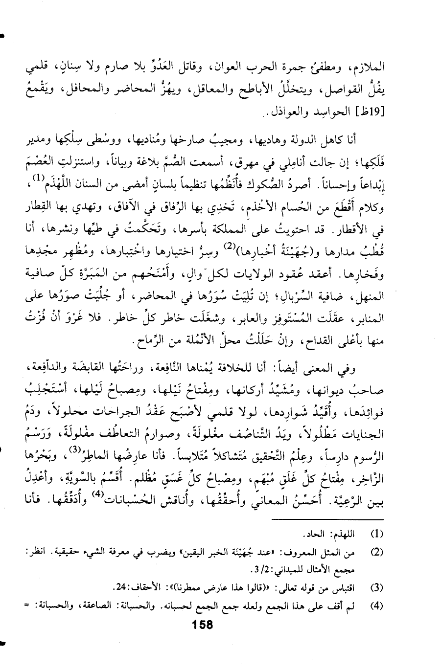 مُبْهَمٍ، ومِصْباحُ كلِّ غَسَقٍ مُظْلم. أُقَسِّمُ بالسَّويَّةِ، وأعْدِلُ بين الرَّعِيَّة. أُحَسِّنُ المعاني وأُحقِّقُها، وأُناقش