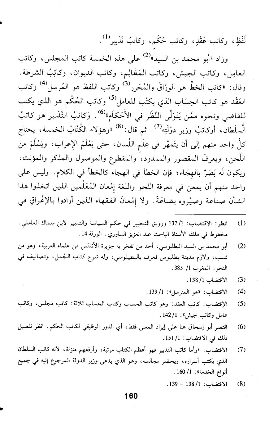 وزاد أبو محمد بن السيد على هذه الخمسة كاتب المجلس، وكاتب العامِل، وكاتب الجيش، وكاتب