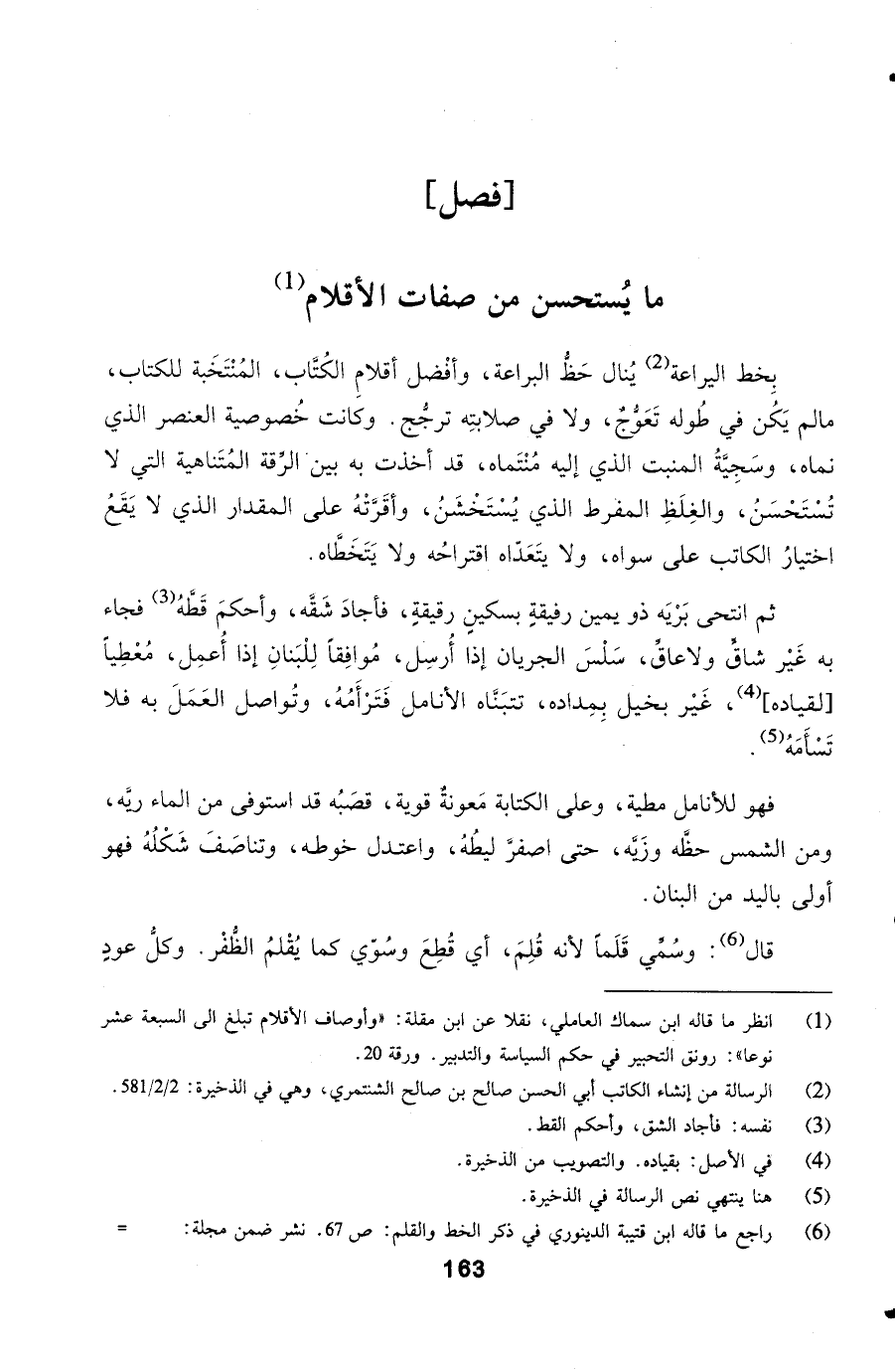 فهو للأنامل مطية، وعلى الكتابة مَعونةٌ قوية، قصَبََُه قد استوفى من الماء ريَّه، ومن الشمس حظَّه