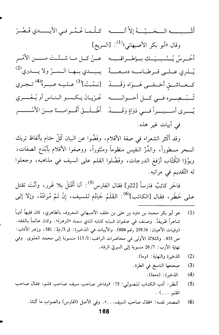 وقد أَكْثر الشعراء في صفة الأقلام، وفَضُّوا عن البيان كُلَّ ختام بألفاظ تريك السحر مسطوراً، والدُّرَّ