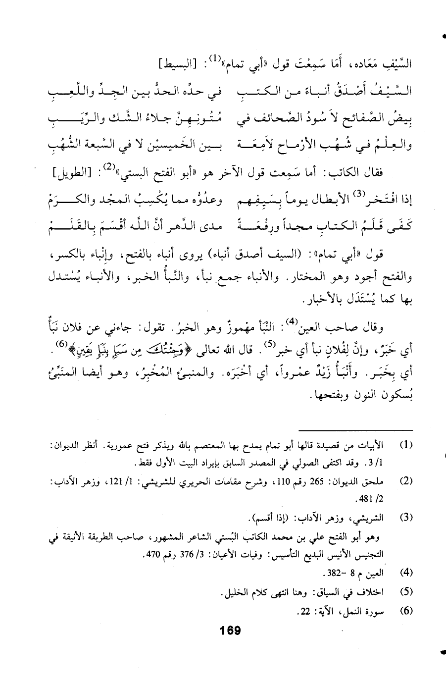 قول أبي تمام: (السيف أصدق أنباء) يروى أنباء بالفتح، وإِنْباء بالكسر، والفتح أجود وهو المختار.