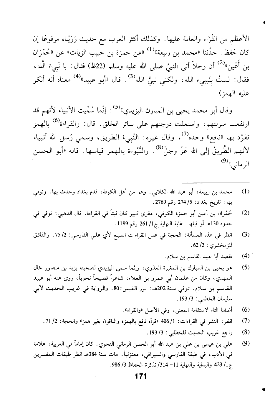 العرب مع حديث رَوَيْناه مرفوعاً إن كان حُفظ. حدَّثنا محمد بن ربيعة عن حمزة بن حبيب الزيات