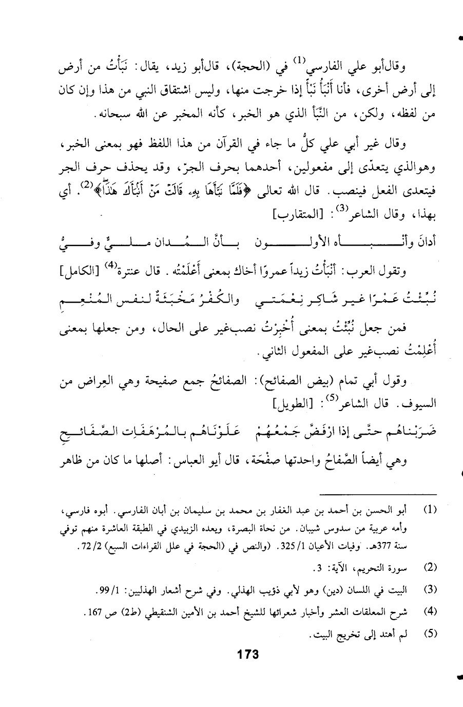 وقال غير أبي علي كلُّ ما جاء في القرآن من هذا اللفظ فهو بمعنى الخبر، وهوالذي يتعدّى إلى