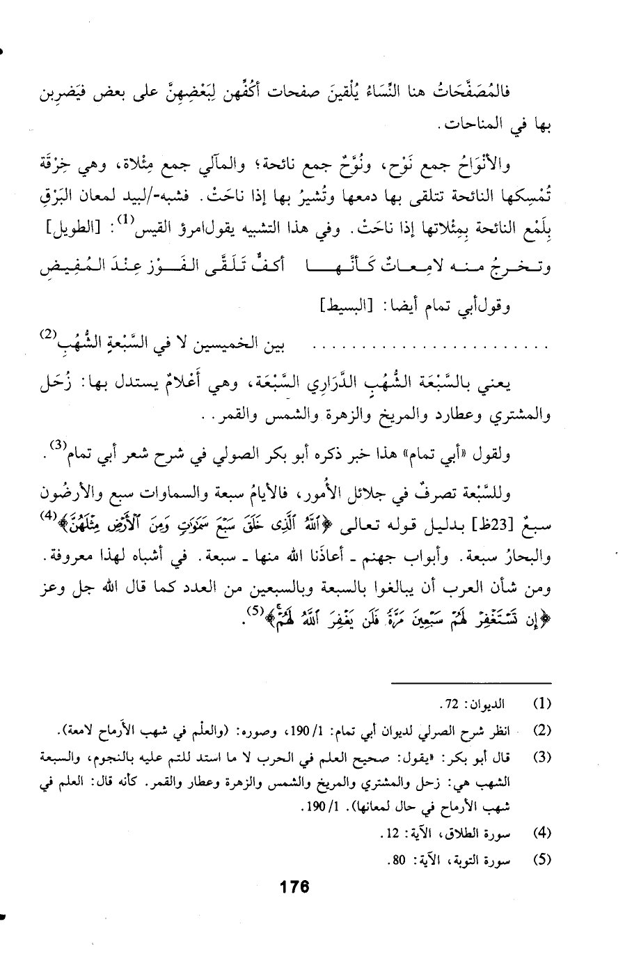 (اللَّهُ الَّذِي خَلَقَ سَبْعَ سَمَاوَاتٍ وَمِنَ الْأَرْضِ مِثْلَهُنَّ) والبحارُ سبعة. وأبواب جهنم - أعاذَنا الله منها - سبعة. في أشباه لهذا معروفة. ومن شأن العرب