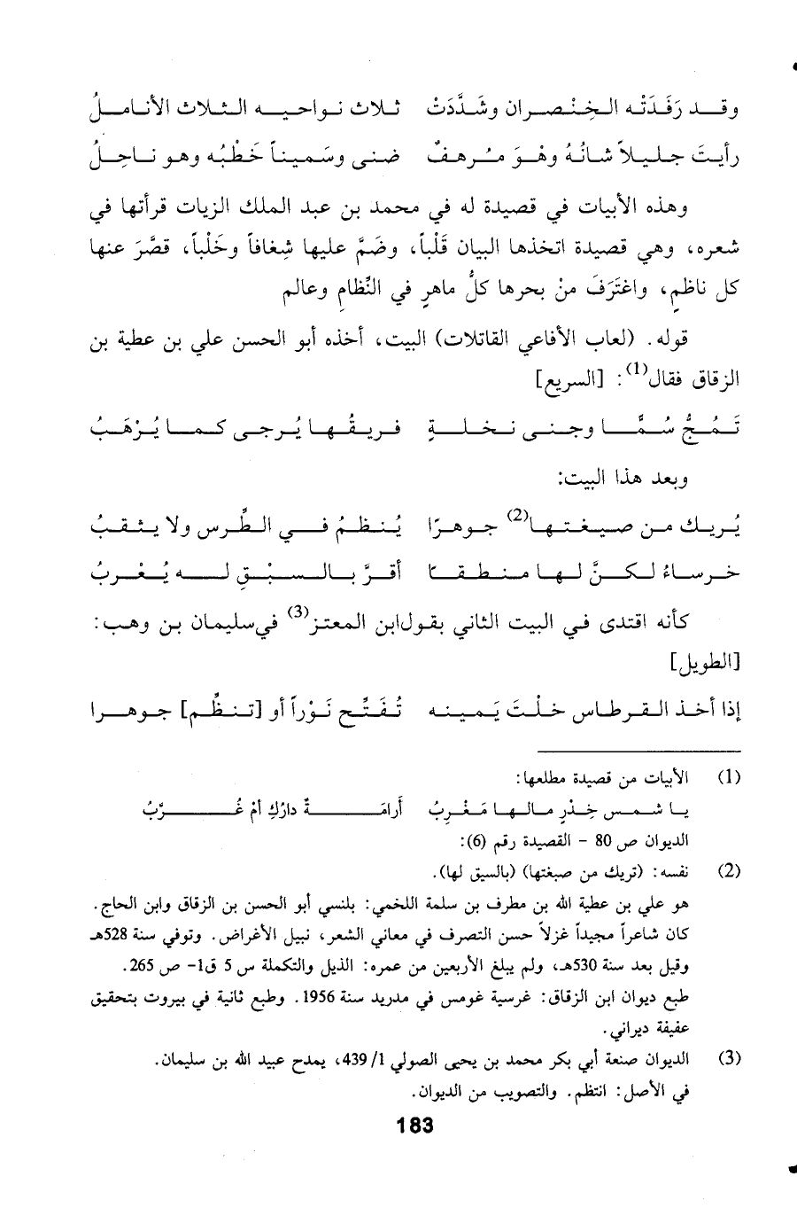 وهذه الأبيات في قصيدة له في محمد بن عبد الملك الزيات قرأتها في شعره، وهي قصيدة اتخذها