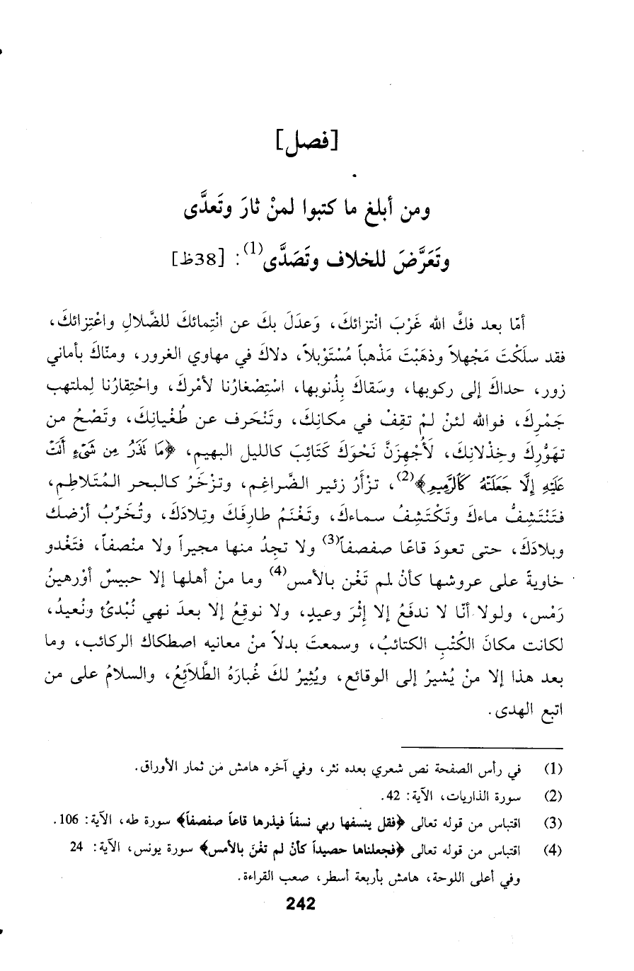 أمّا بعد فكَّ الله غَرْبَ انْتزائكَ، وَعدَلَ بكَ عن انْتِمائكَ للضَّلالِ واعْتِزائكَ، فقد سلَكْتَ مَجْهلاً وذهَبْتَ