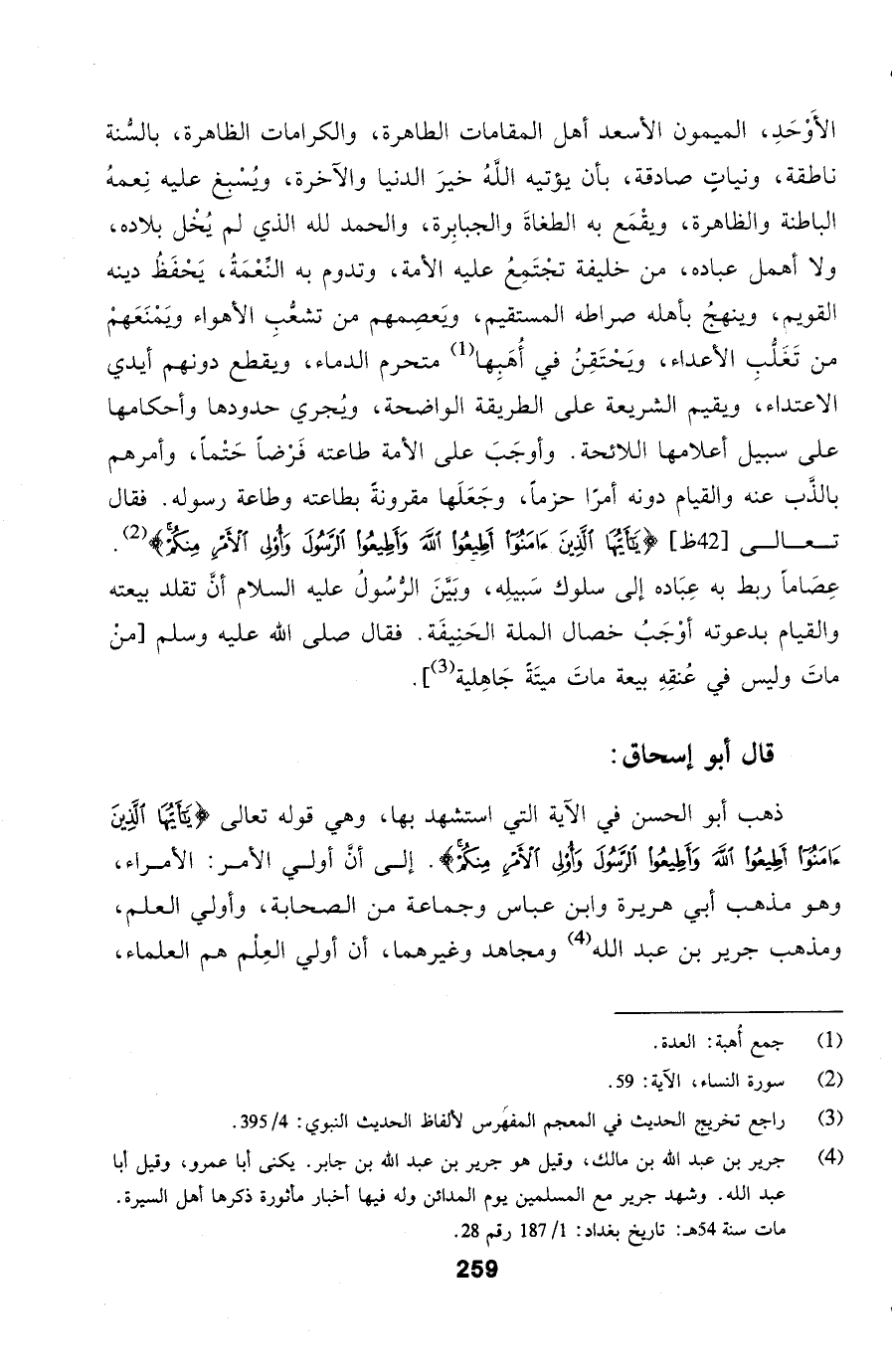 حزماً، وجَعَلَها مقرونةً بطاعته وطاعة رسوله. فقال تعالى (يَا أَيُّهَا الَّذِينَ آمَنُوا أَطِيعُوا اللَّهَ وَأَطِيعُوا الرَّسُولَ وَأُولِي الْأَمْرِ مِنْكُمْ). عِصَاماً ربط به عِبَاده إلى سلوك