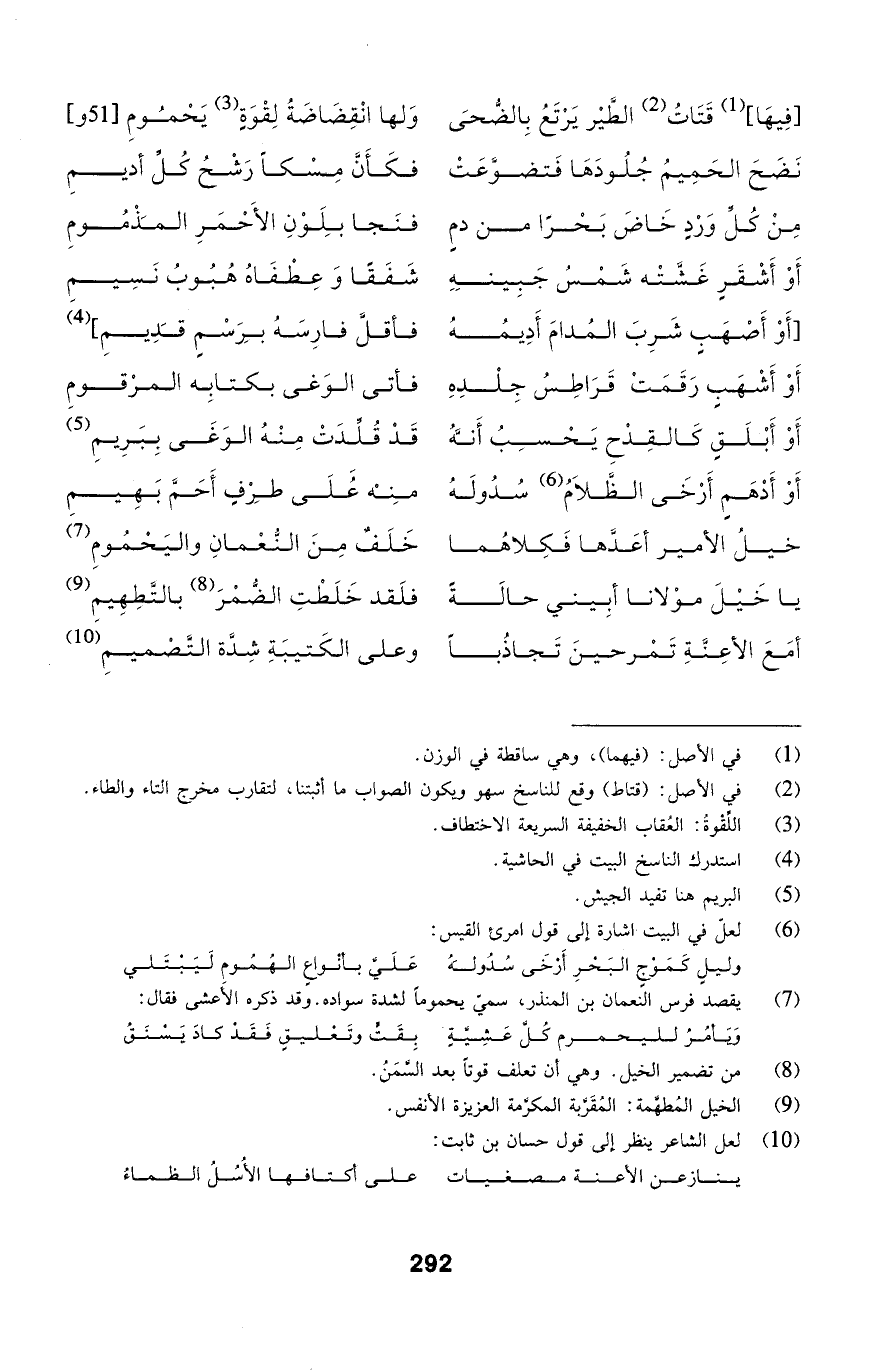 فِيهَا قَتَاتُ الطَّيْر يَرْتَعُ بِالضُّحَى ... وَلها انْقِضَاضَةُ لِقْوَةٍ يَحْمُومِ