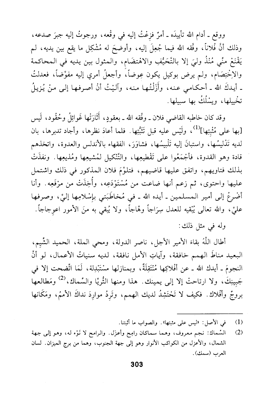 أيده الله - في مُخاطَبَتي بإِسْلامِها إليَّ، وصرفها عليَّ، والله تعالى يُبْقيه للعدل سِرَاجاً وهَّاجاً، ولا يُبقي