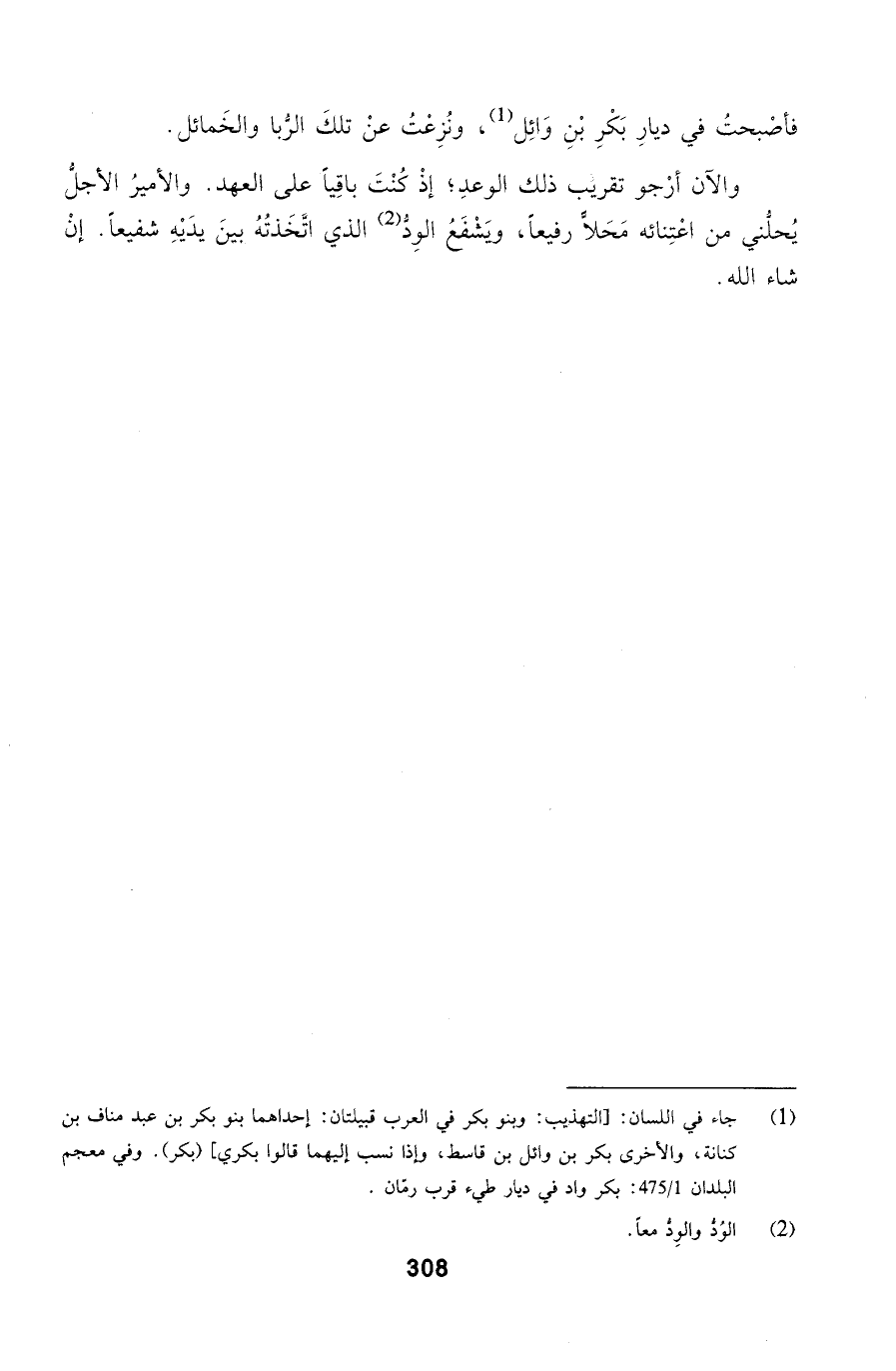 فأصْبحتُ في ديارِ بَكْرِ بْنِ وَائِل ... ونُزِعْتُ عنْ تلكَ الرُّبا والخَمائل.