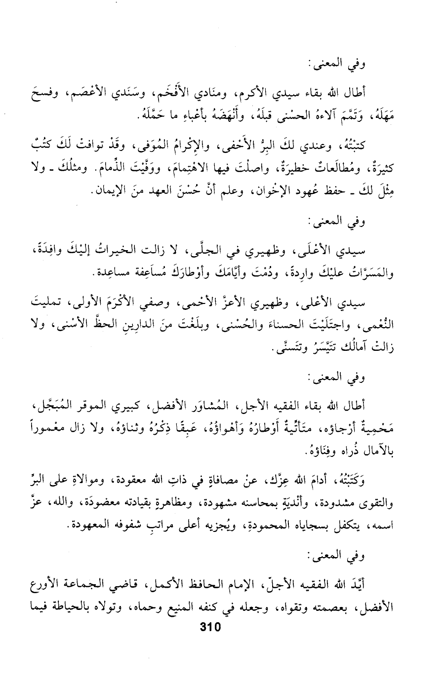 أطال الله بقاء سيدي الأكرم، ومنَادي الأَفْخَم، وسَنَدي الأعْصَم، وفسحَ مَهَلَهُ، وَتَمَّمَ آلاءهُ الحسْنى قبلَهُ،