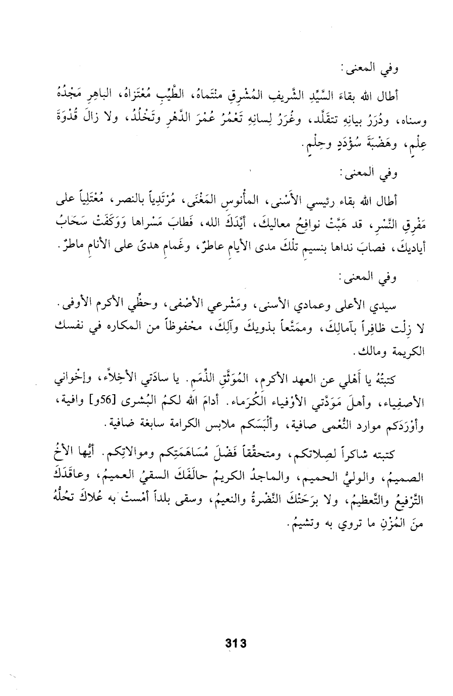 أطال الله بقاءَ السَّيِّدِ الشَّريفِ المُشْرِقِ منْتَماهُ، الطَّيِّبِ مُعْتَزاهُ، الباهِرِ مَجْدُهُ وسناه، ودُرَرُ بيانِهِ تتقَلَّد،