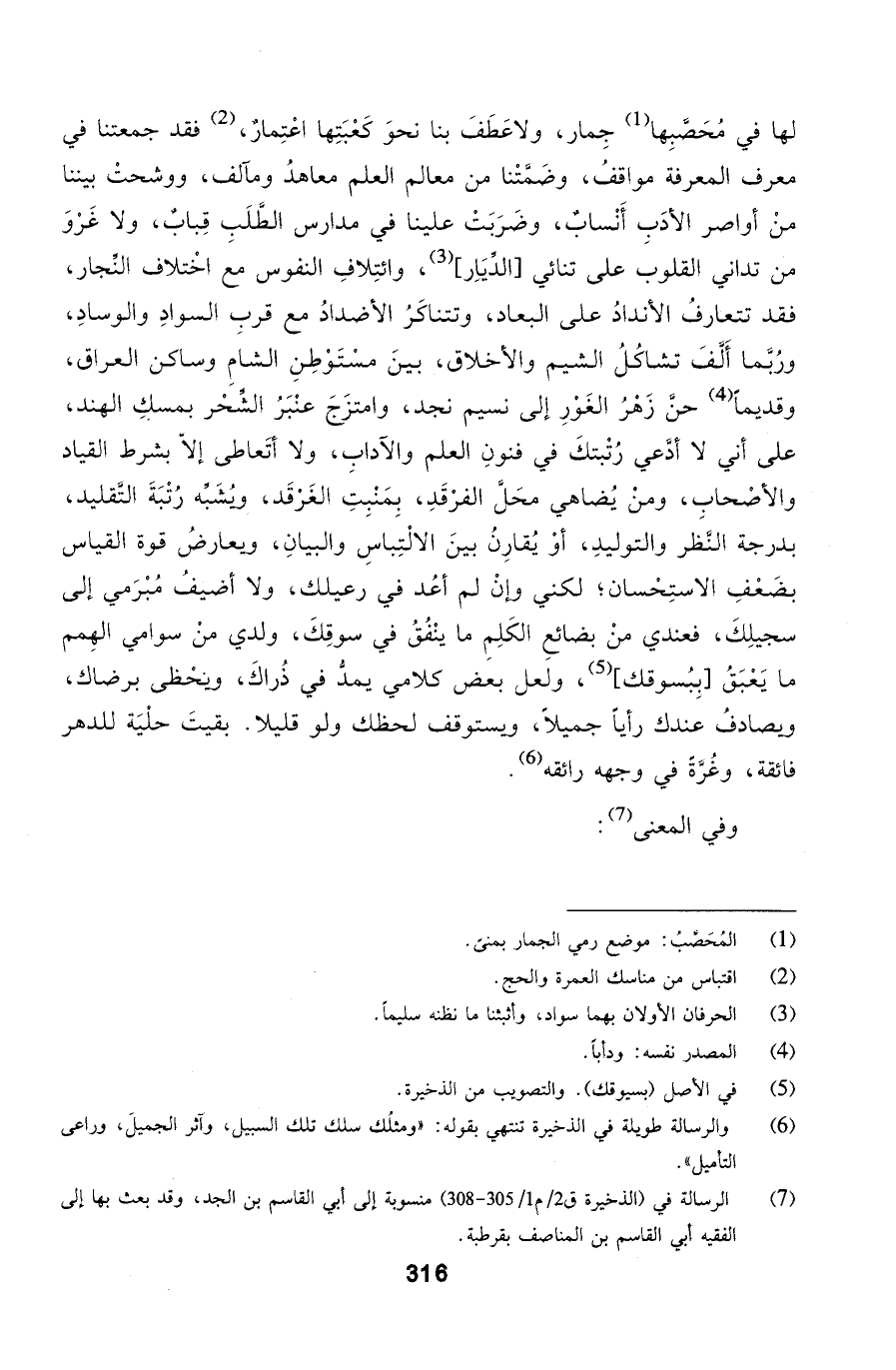 لها في مُحَصَّبِها جِمار، ولاعَطَفَ بنا نحوَ كَعْبَتِها اعْتِمارٌ، فقد جمعتنا في معرف المعرفة مواقفُ، وضَمَّتْنا من معالم العلم