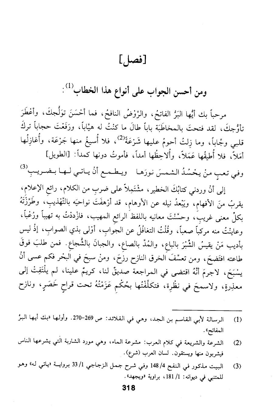 إلى أنْ وردني كتابُكَ الخطير، مشْتَمِلاً على ضربِ من الكلام، رائعِ الإعلامِ، يقربُ منَ الأفهامِ،