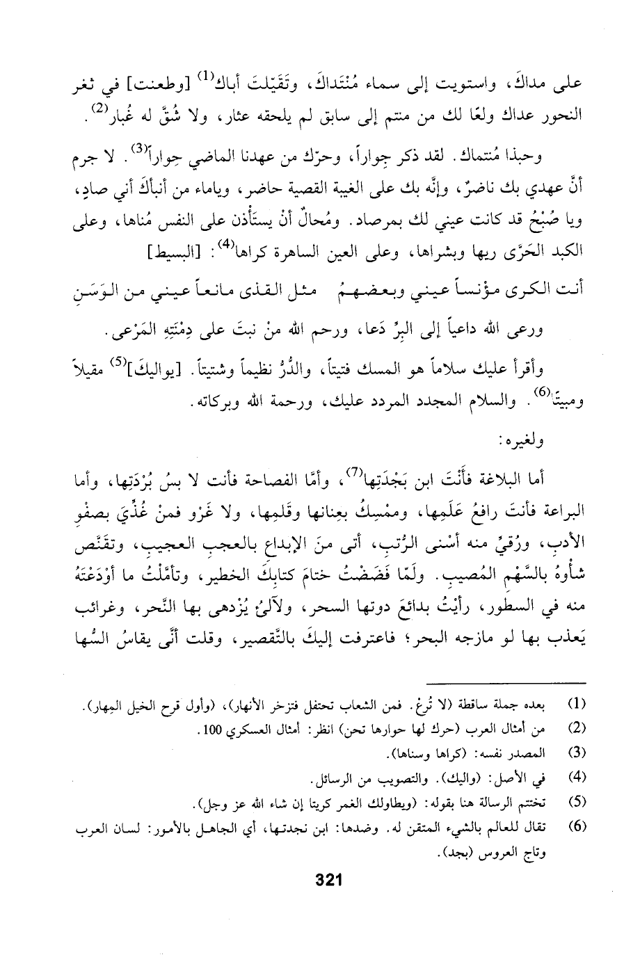 على مداكَ، واستويت إلى سماء مُنْتَداكَ، وتَقَيّلتَ أباك وطعنت في ثغر النحور عداك ولعاً لك من منتم إلى سابق لم يلحقه عثار، ولا شُقَّ له غُبار. وحبذا مُنتماك. لقد ذكر جِواراً، وحرّك من عهدنا الماضي حِواراً. لا جرم أنَّ عهدي بك ناضرٌ، وإنَّه