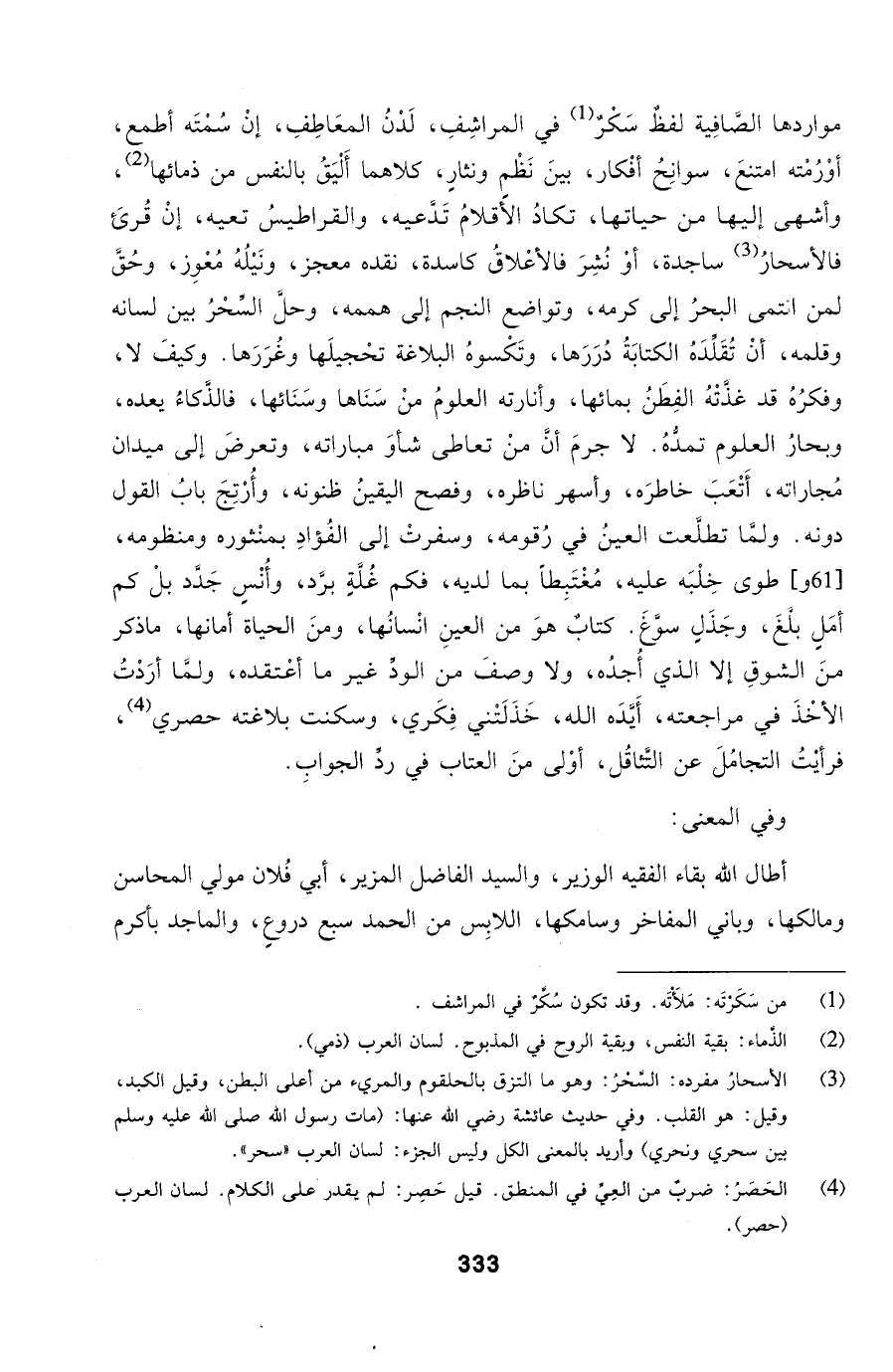 فِكَري، وسكنت بلاغته حصري، فرأيْتُ التجامُلَ عن التَّثاقُل، أوْلى منَ العتاب في ردِّ الجوابِ.