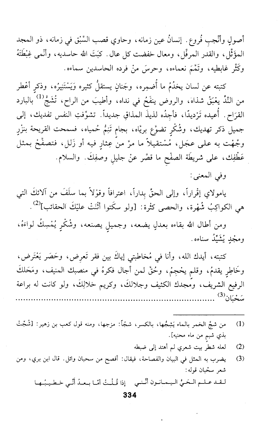 كتبته، أيدك الله، وأنا في مُخاطبتي إياكَ بين فقر تَعرِض، وحَصَر يَعْتَرض، وخَاطِرٍ يقدمُ، وقلمٍ