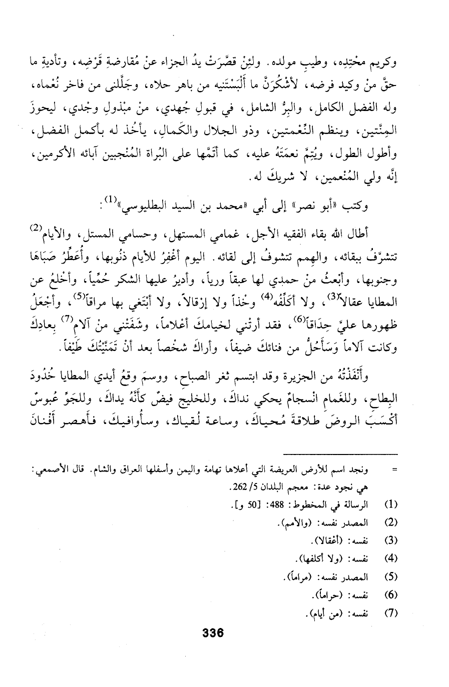 وكتب أبو نصر إلى أبي محمد بن السيد البطليوسي:
