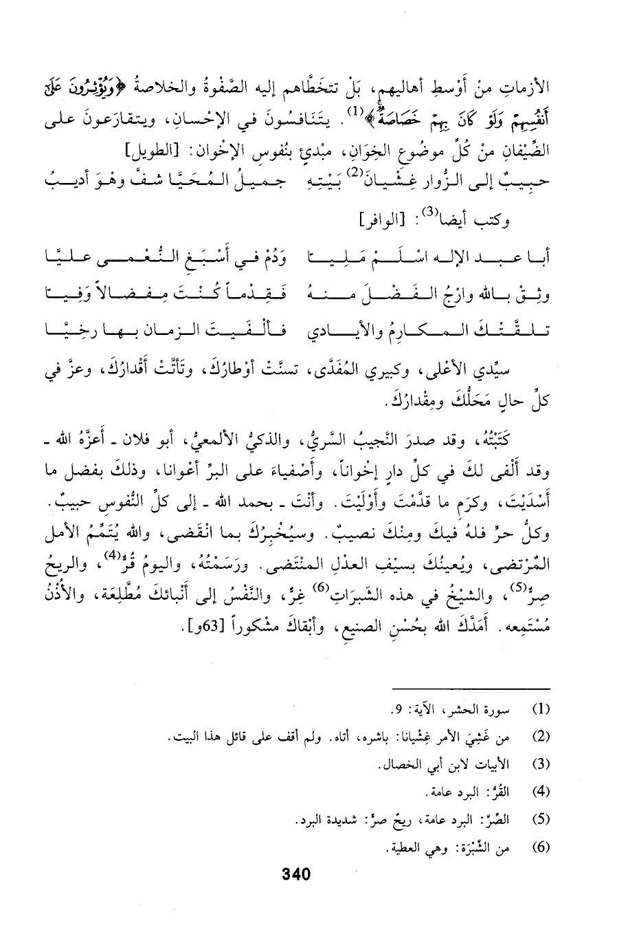 الشَبرَاتِ غِرٌّ، والنَّفْسُ إلى أَنْبائكَ مُطَّلِعَة، والأُذْنُ مُسْتَمِعه. أَمَدَّكَ الله بحُسْنِ الصنيعِ، وأبْقاكَ مشْكوراً.