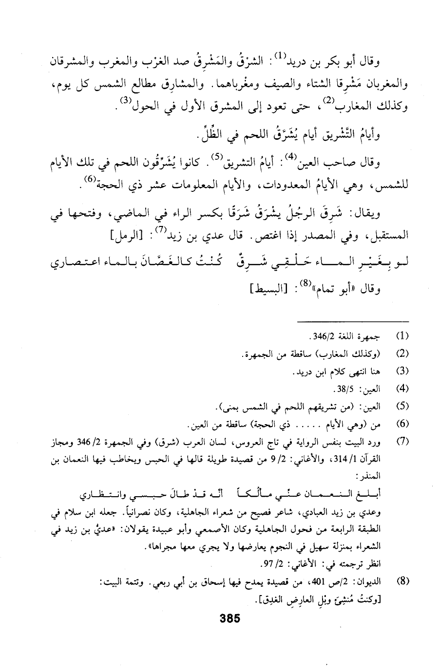 وقال صاحب العين: أيامُ التشريق. كانوا يُشَرِّقُون اللحم في تلك الأيام للشمس، وهي الأيامُ