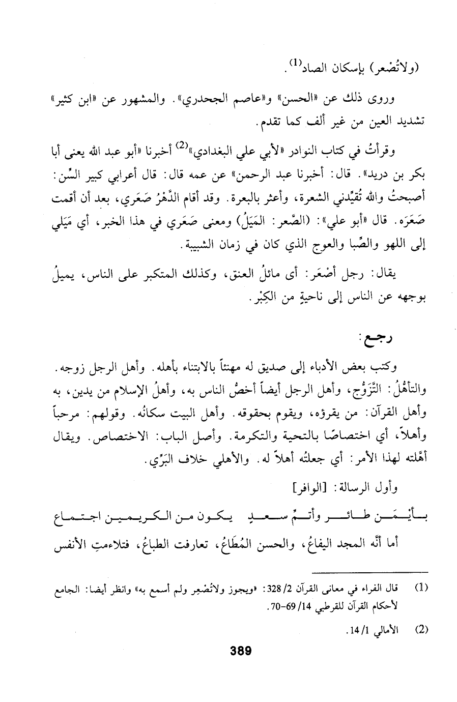 يقال: رجل أصْعَر: أى مائلُ العنق، وكذلك المتكبر على الناس، يميلُ بوجهه عن الناس إلى ناحيةٍ