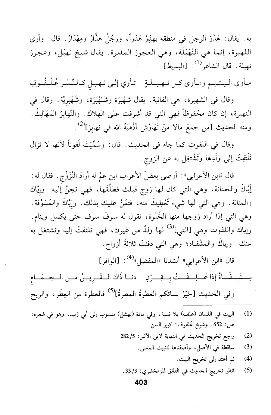 وقال في الشهبرة، هي الفانية. يقال شَهْبَرَة وشَنَهْبَرَة، وشَهْبَرِيَّة. وقال في النهبرة، إن كان محْفوظاً