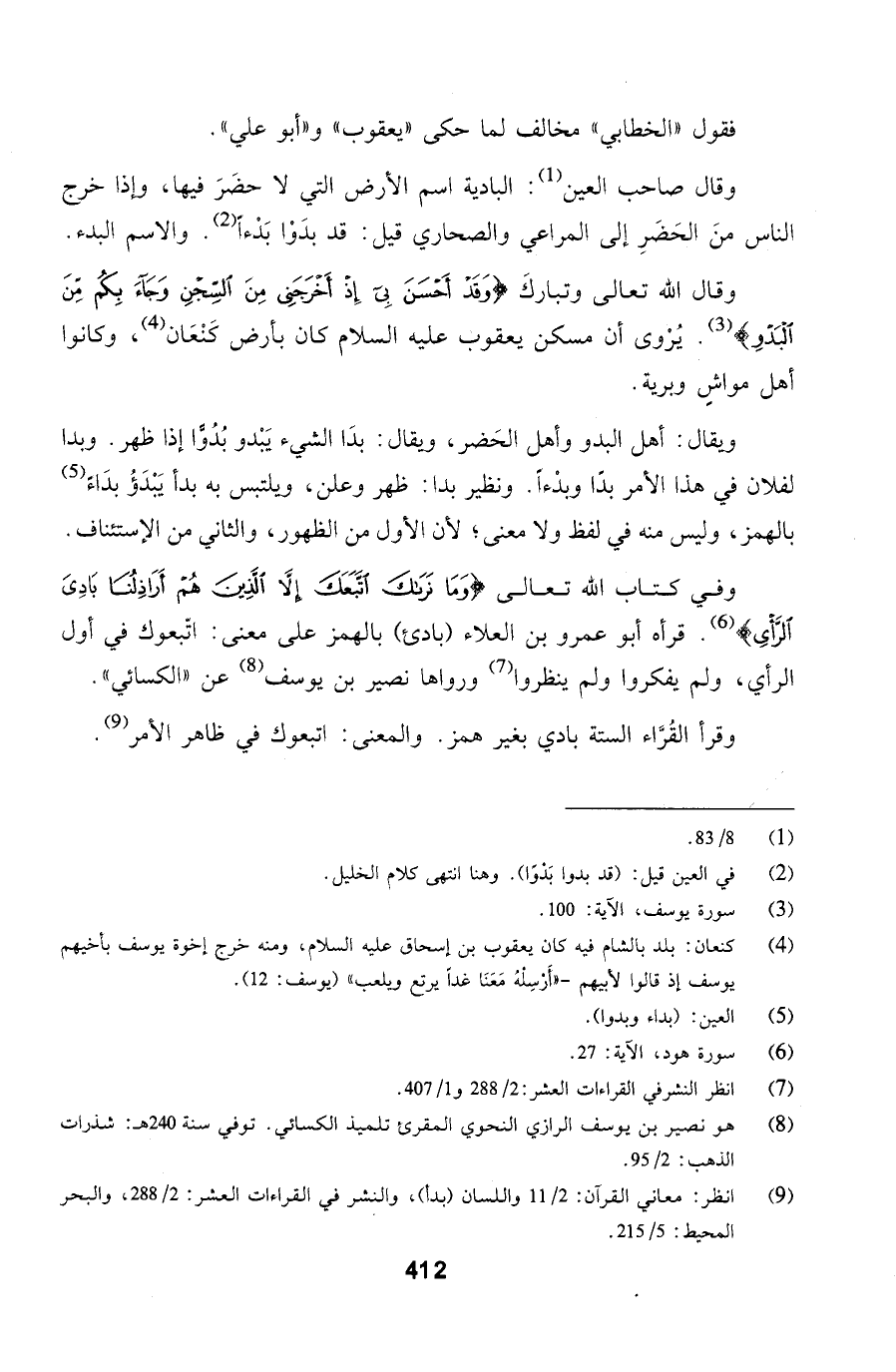 وفي كتاب الله تعالى (وَمَا نَرَاكَ اتَّبَعَكَ إِلَّا الَّذِينَ هُمْ أَرَاذِلُنَا بَادِيَ الرَّأْيِ). قرأه أبو عمرو بن العلاء (بادئ) بالهمز على معنى: اتّبعوك في أول