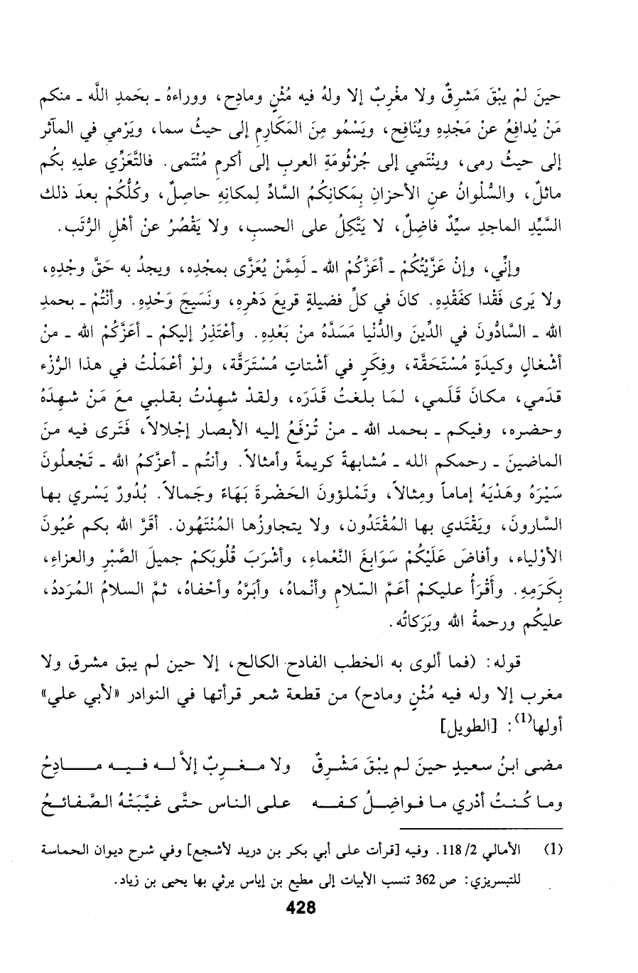 حينَ لمْ يبْقَ مَشرِقٌ ولا مغْرِبٌ إلا ولهُ فيه مُثْنٍ ومادِح، ووراءهُ - بحَمدِ اللَّه - منكم مَنْ يُدافِعُ عنْ مَجْدِهِ ويُنَافِح، ويَسْمُو مِنَ