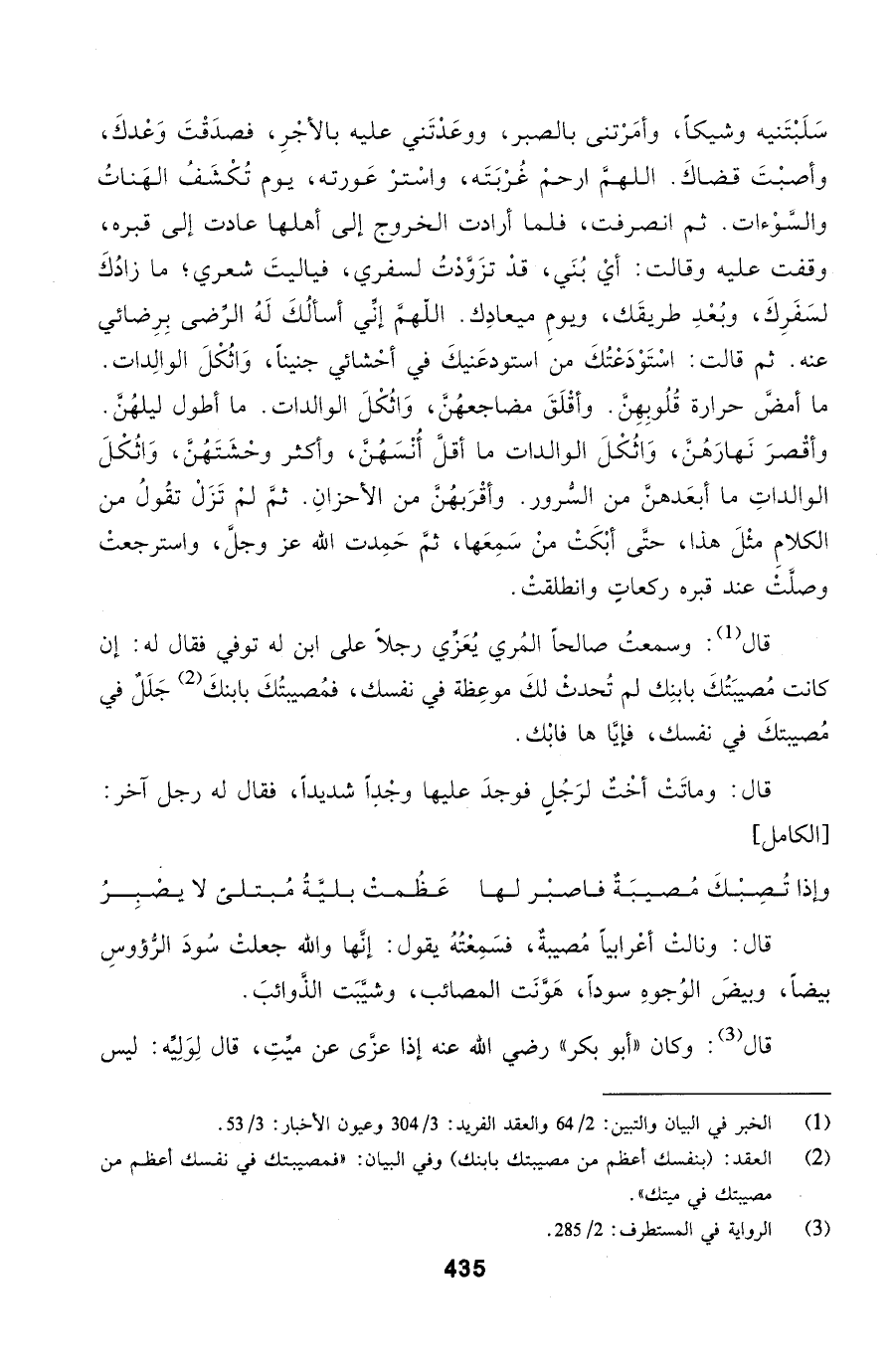 قال: وكان أبو بكر رضي الله عنه إذا عزَّى عن ميِّتِ، قال لِوَلِيِّه: ليس