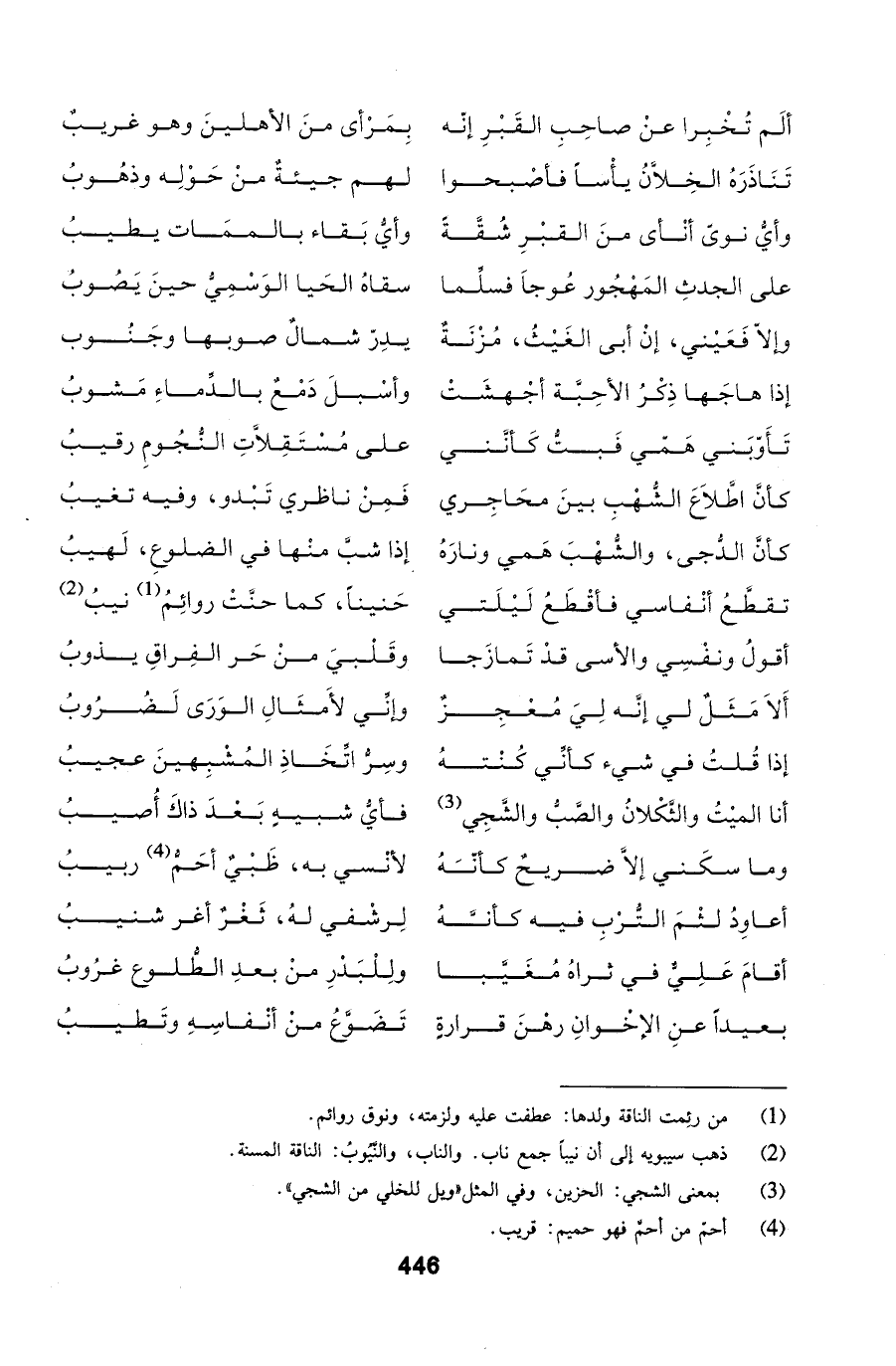 ألَم تُخْبِرا عنْ صاحِبِ القَبْرِ إنّه ... بِمَرْأى منَ الأهلينَ وهو غريبٌ