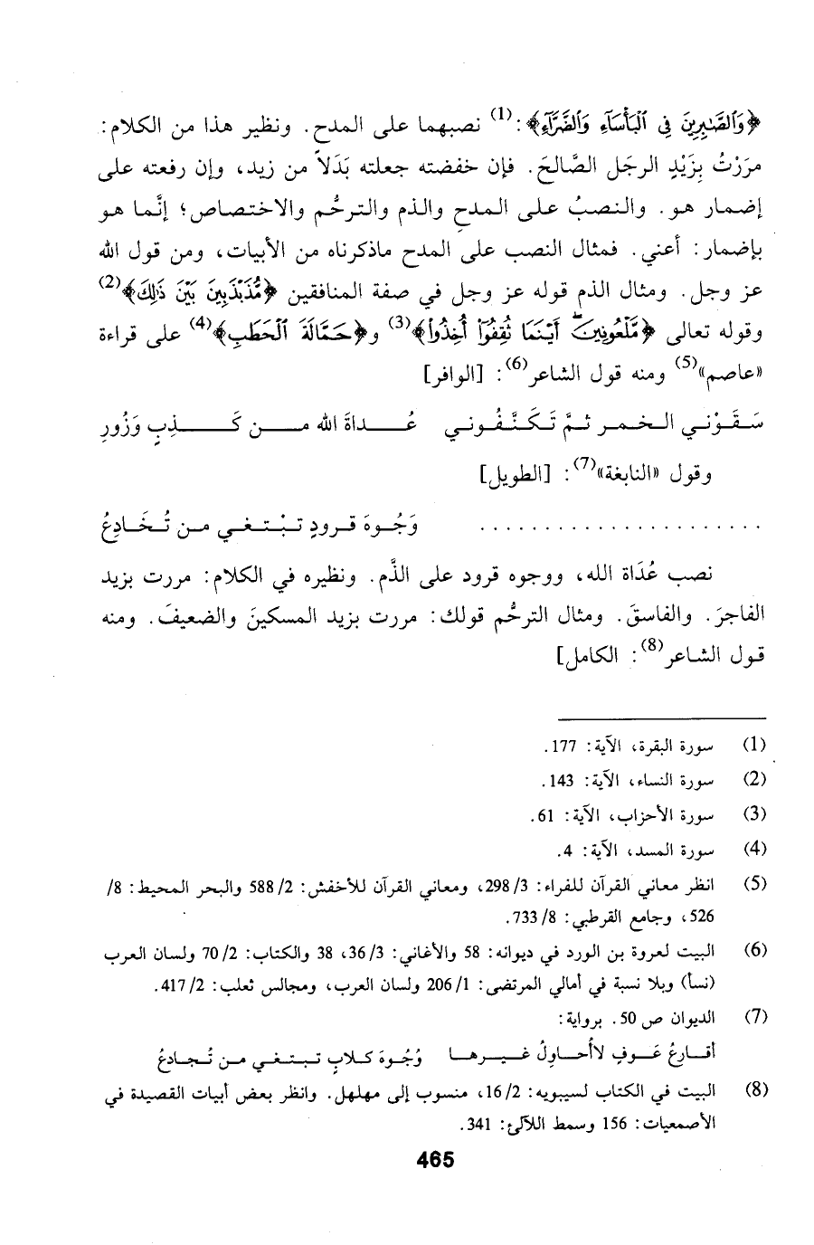 (وَالصَّابِرِينَ فِي الْبَأْسَاءِ وَالضَّرَّاءِ): نصبهما على المدح. ونظير هذا من الكلام: