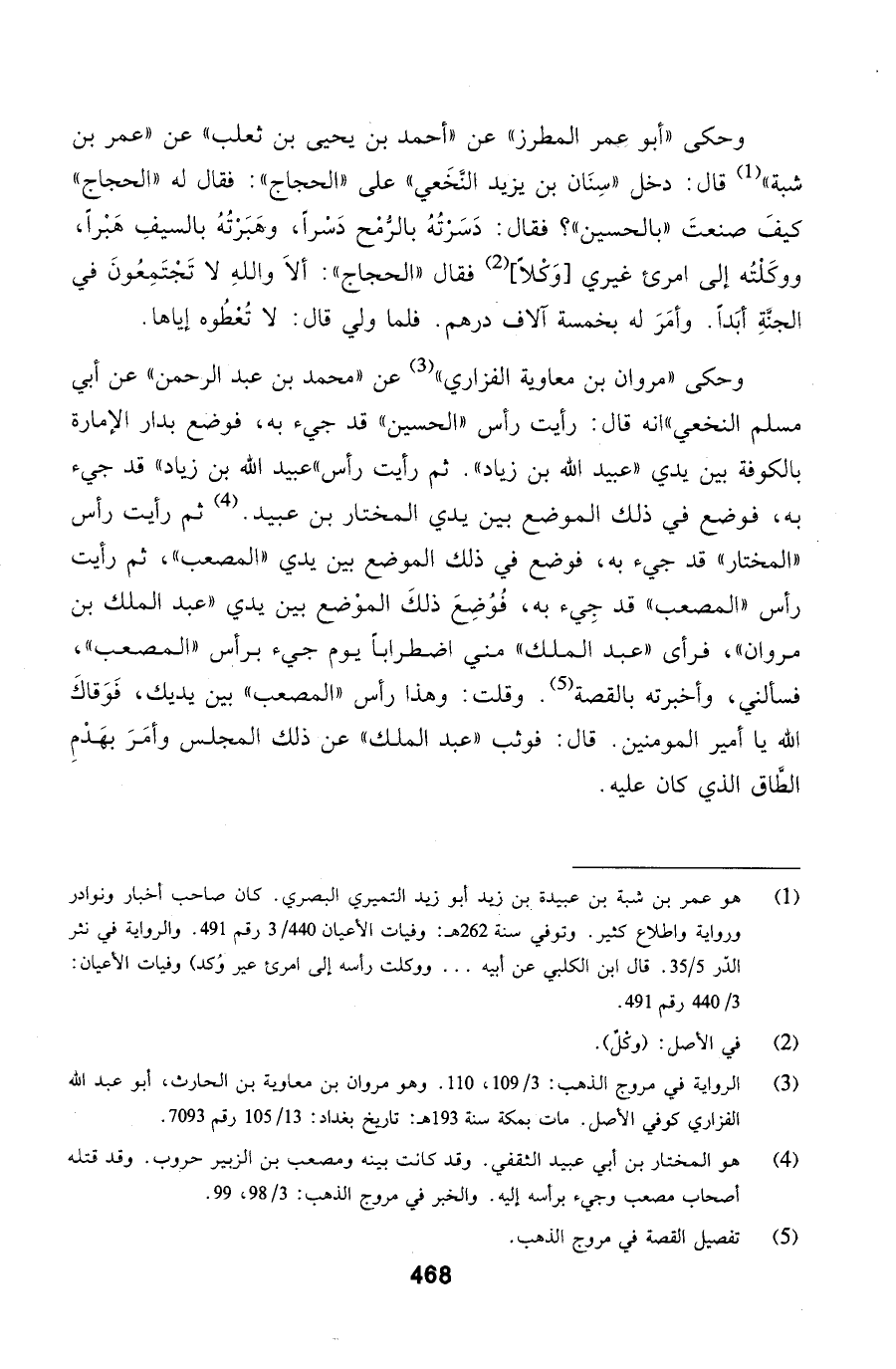 النَّخَعي على الحجاج: فقال له الحجاج كيفَ صنعتَ بالحسين؟ فقال: دَسَرْتُهُ بالرُّمْح دَسْراً، وهَبَرْتُهُ