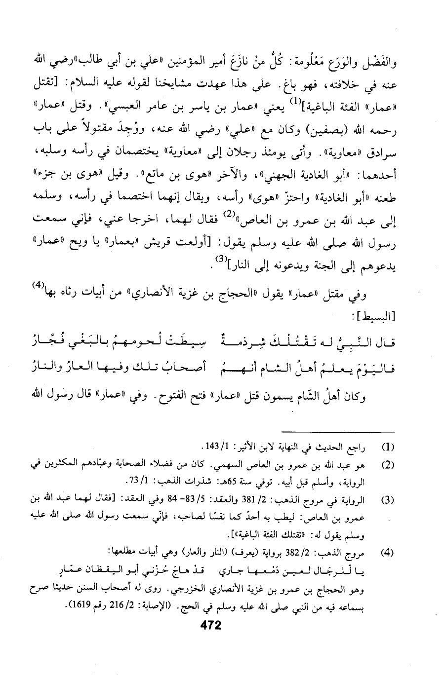 والفَضْل والوَرَع مَعْلُومة: كُلُّ منْ نازَعَ أمير المؤمنين علي بن أبي طالب رضي الله عنه في خلافته، فهو باغ. على هذا عهدت