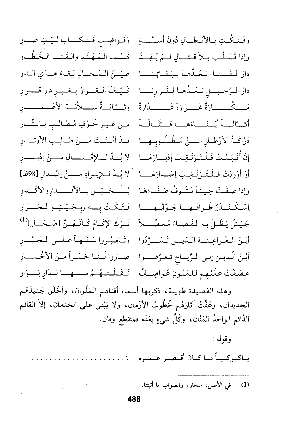 وهذه القصيدة طويلة، ذكربها أسماء أفناهم المَلَوان، وأخْلََق جَديدَهُم الجديدان، وعَفَّتْ آثارَهُم خُطُوبُ