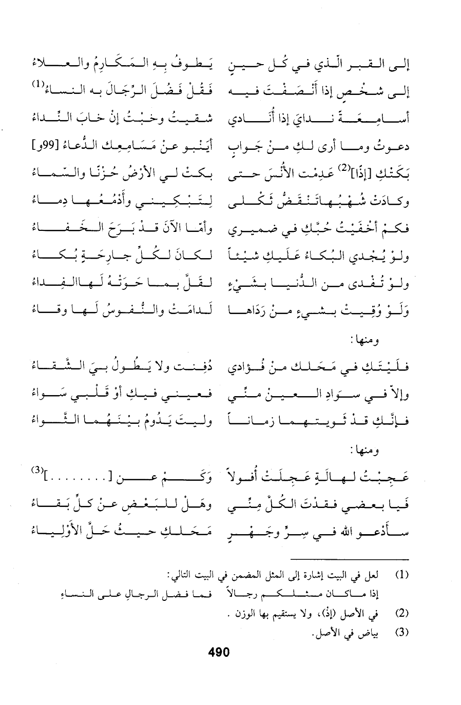 فلَيْتَكِ في مَحَلك منْ فُؤادي ... دُفِنت ولا يَطُولُ بيَ الشَّقاءُ