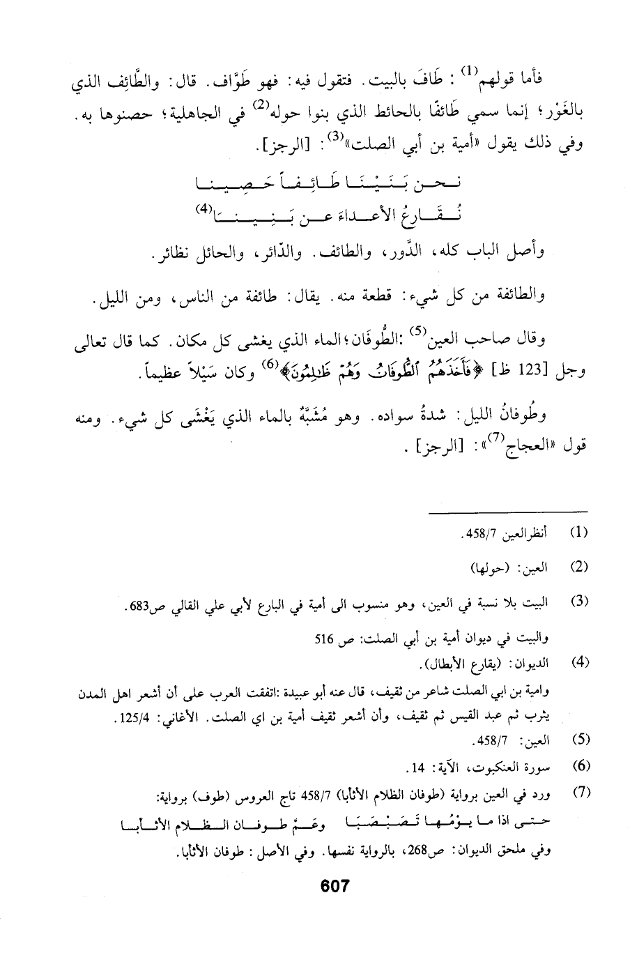 وقال صاحب العين الطُّوفَان؛ الماء الذي يغشى كل مكان. كما قال تعالى وجل (فَأَخَذَهُمُ الطُّوفَانُ وَهُمْ ظَالِمُونَ) وكان سَيْلاً عظيماً.