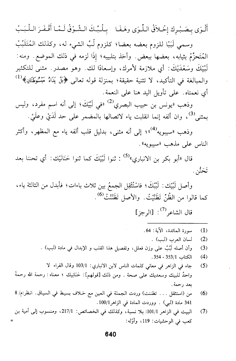 وذهب يونس بن حبيب البصري في لَبَّيْكَ؛ إلى أنه اسم مفرد، وليس بمثنى، وان ألفه إنما انقلبت