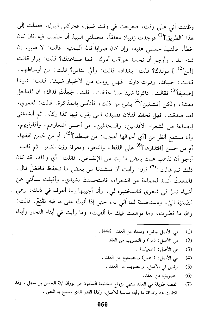 فحملني النبيذ أن جلست فيه فان كان خطأ، فالنبيذ حملني عليه، وإن كان صوابا فالله ألهمنيه. قالت: لا ضير، إن شاء الله. وأرجو أن تحمد عواقب أمرك. فما صناعتك؟ قلت: بزاز قالت أين: مولدك؟ قلت: بغداد، قالت: وأيِّ الناس؟