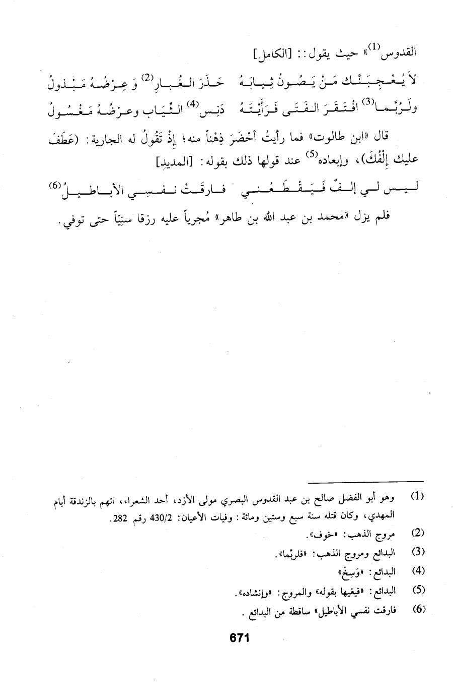 قال ابن طالوت فما رأيتُ أحْضَرَ ذِهْناً منه؛ إِذْ تَقُولُ له الجارية: (عَطَفَ عليك إِلْفُكَ)، وإبعاده عند