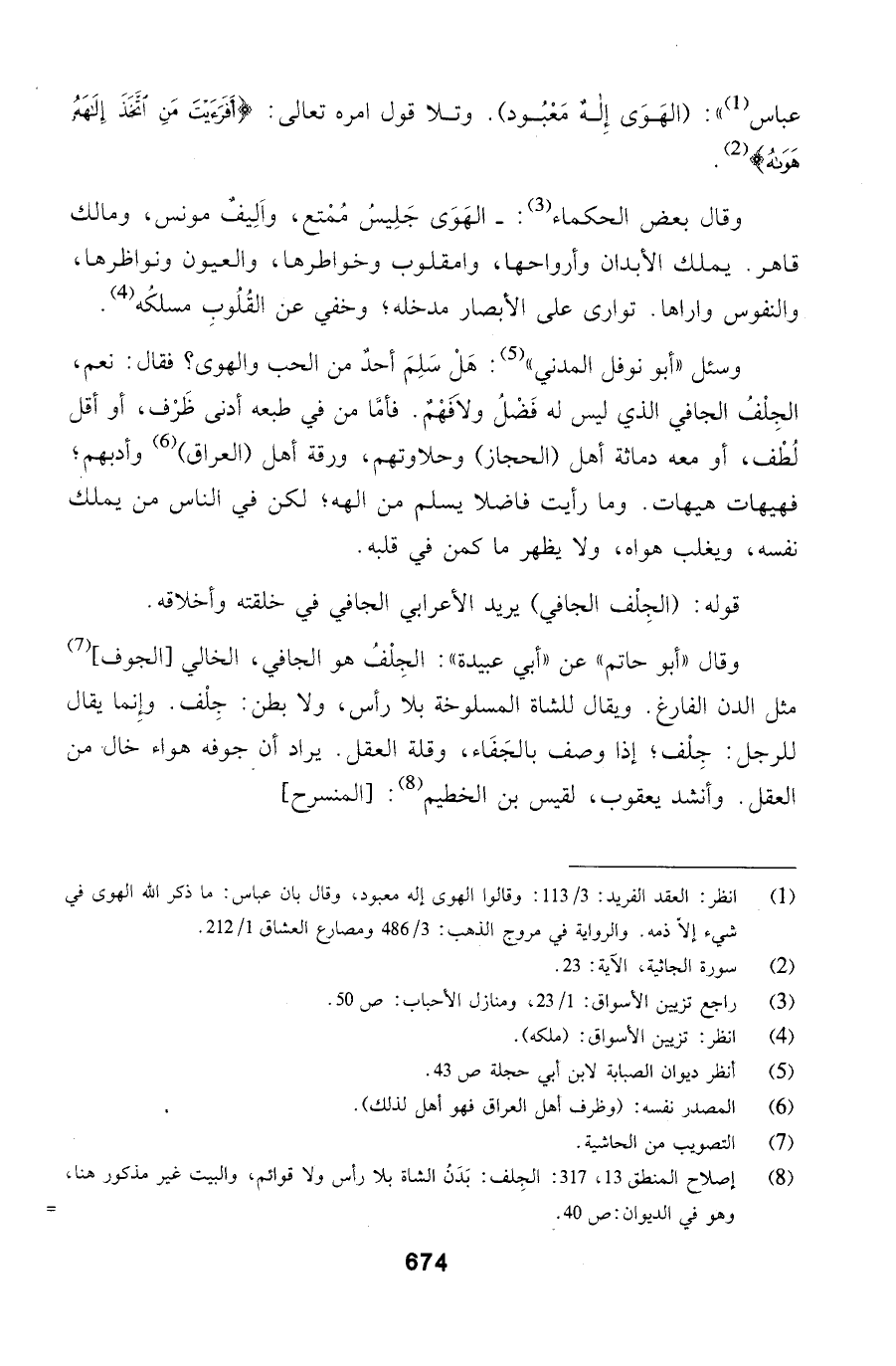 عباس: (الهَوَى إِلهٌ مَعْبُود). وتلا قول امره تعالى: (أَفَرَأَيْتَ مَنِ اتَّخَذَ إِلَهَهُ هَوَاهُ).