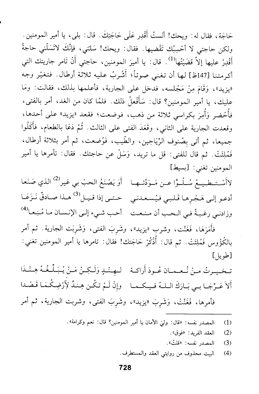 فأَمَرَهَا، فَغَنَّت، وشرب يزيد، وشَرِبَ الفتى، وَشَرِبَت الجارية. ثم أمر