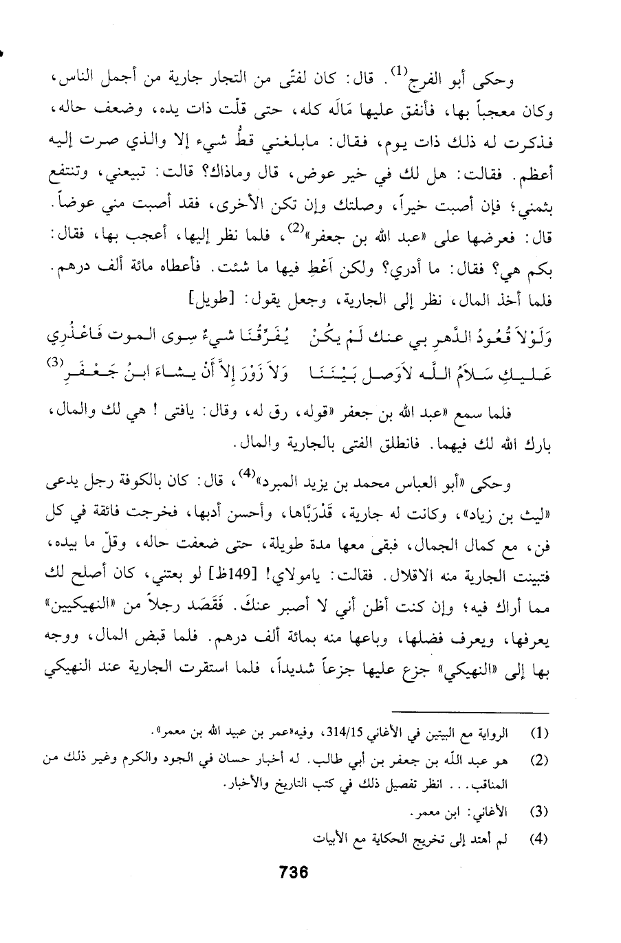 وحكى أبو الفرج. قال: كان لفتًى من التجار جارية من أجمل الناس، وكان معجباً بها، فأنفق عليها