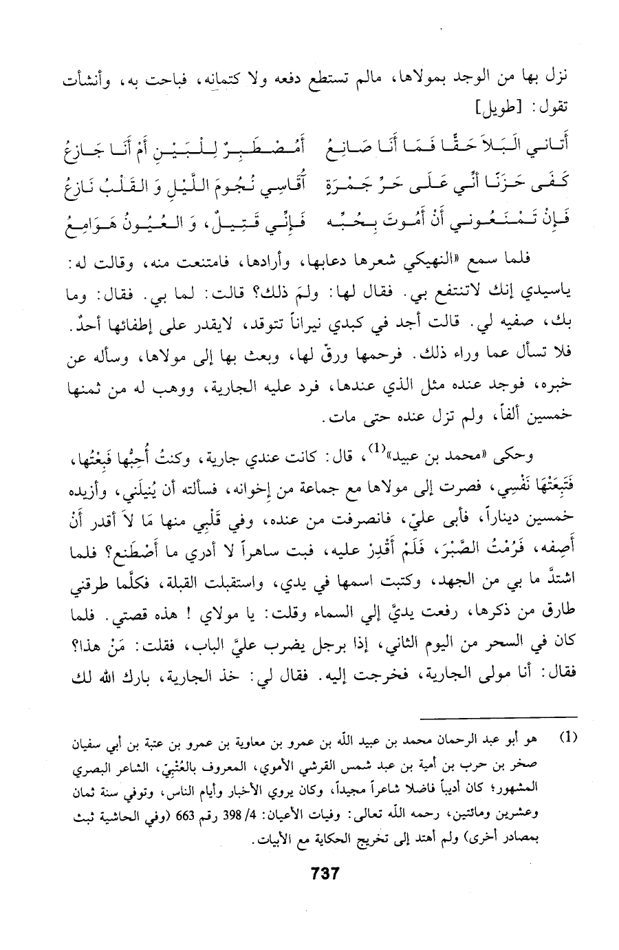 وحكى محمد بن عبيد، قال: كانت عندي جارية، وكنتُ أُحِبُّها فَبِعْتُها، فَتَبِعَتْهَا نَفْسِي، فصرت إلى
