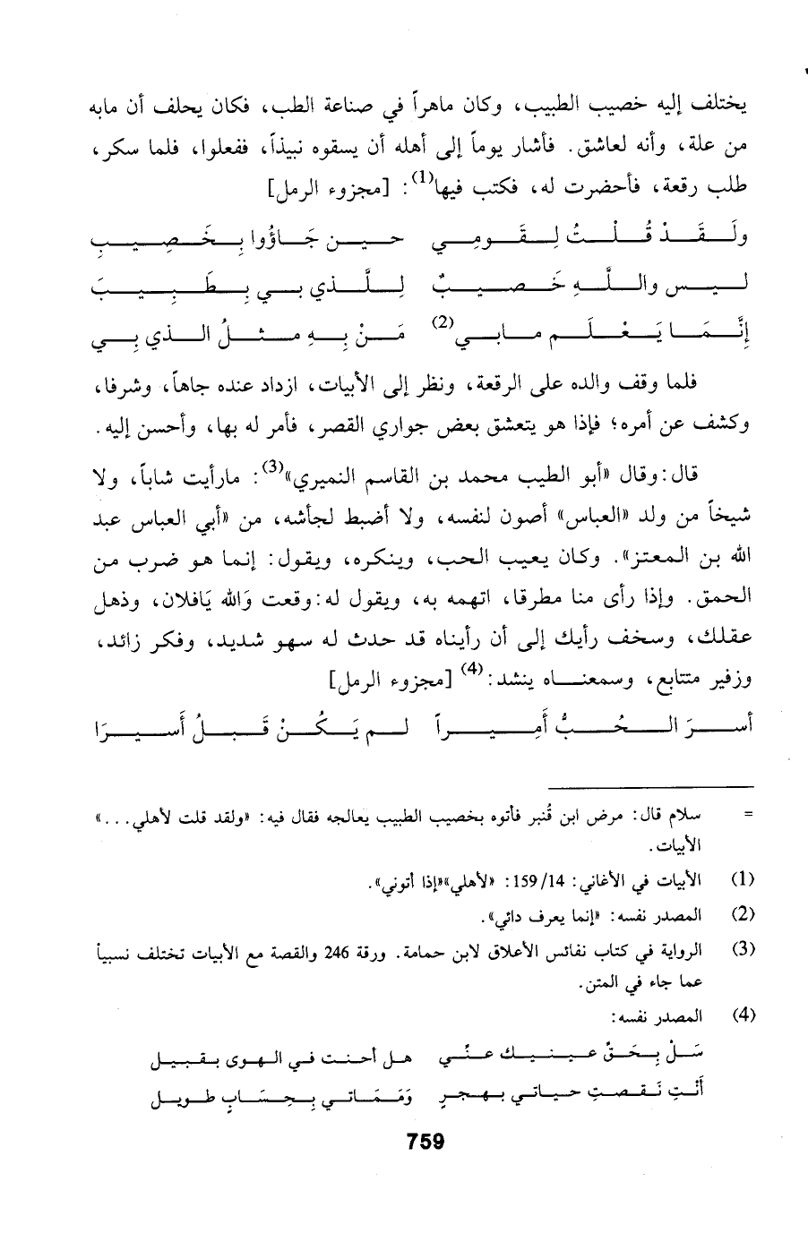 يختلف إليه خصيب الطبيب، وكان ماهراً في صناعة الطب، فكان يحلف أن مابه من علة، وأنه لعاشق.
