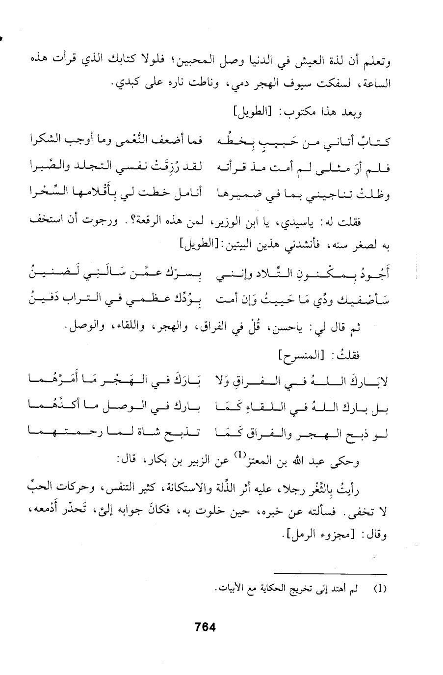 ثم قال لي: ياحسن، قُلْ في الفراق، والهجر، واللقاء، والوصل.