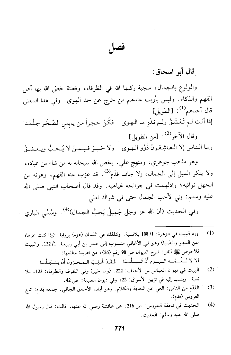 قال أبو اسحاق: والولوع بالجمال، سجية ركبها الله في الظرفاء، وفطنة خصّ الله بها أهل الفهم والذكاء. وليس