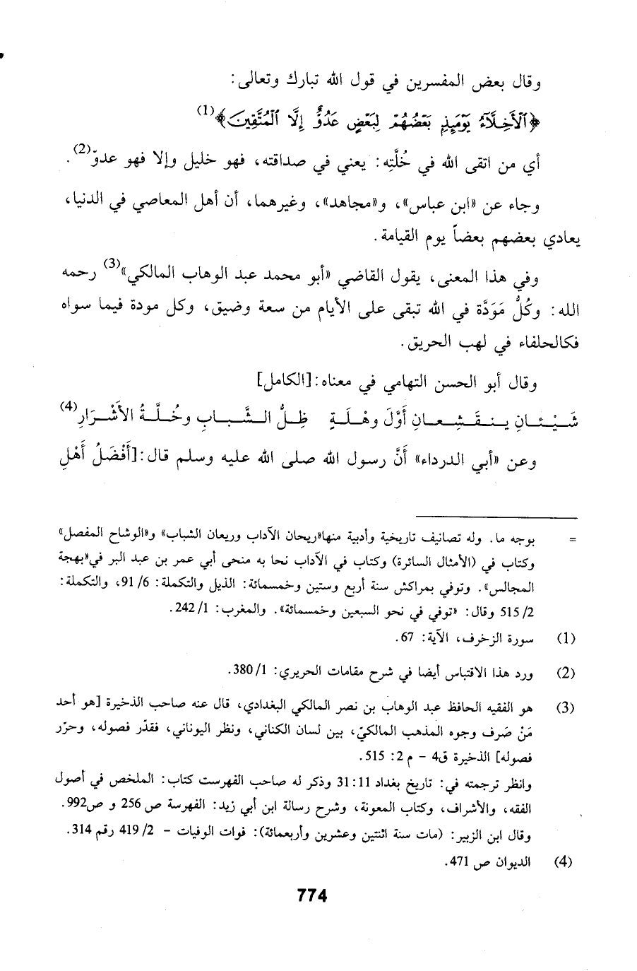 وفي هذا المعنى، يقول القاضي أبو محمد عبد الوهاب المالكي رحمه الله: وكُلُّ مَوَدَّة في الله تبقى
