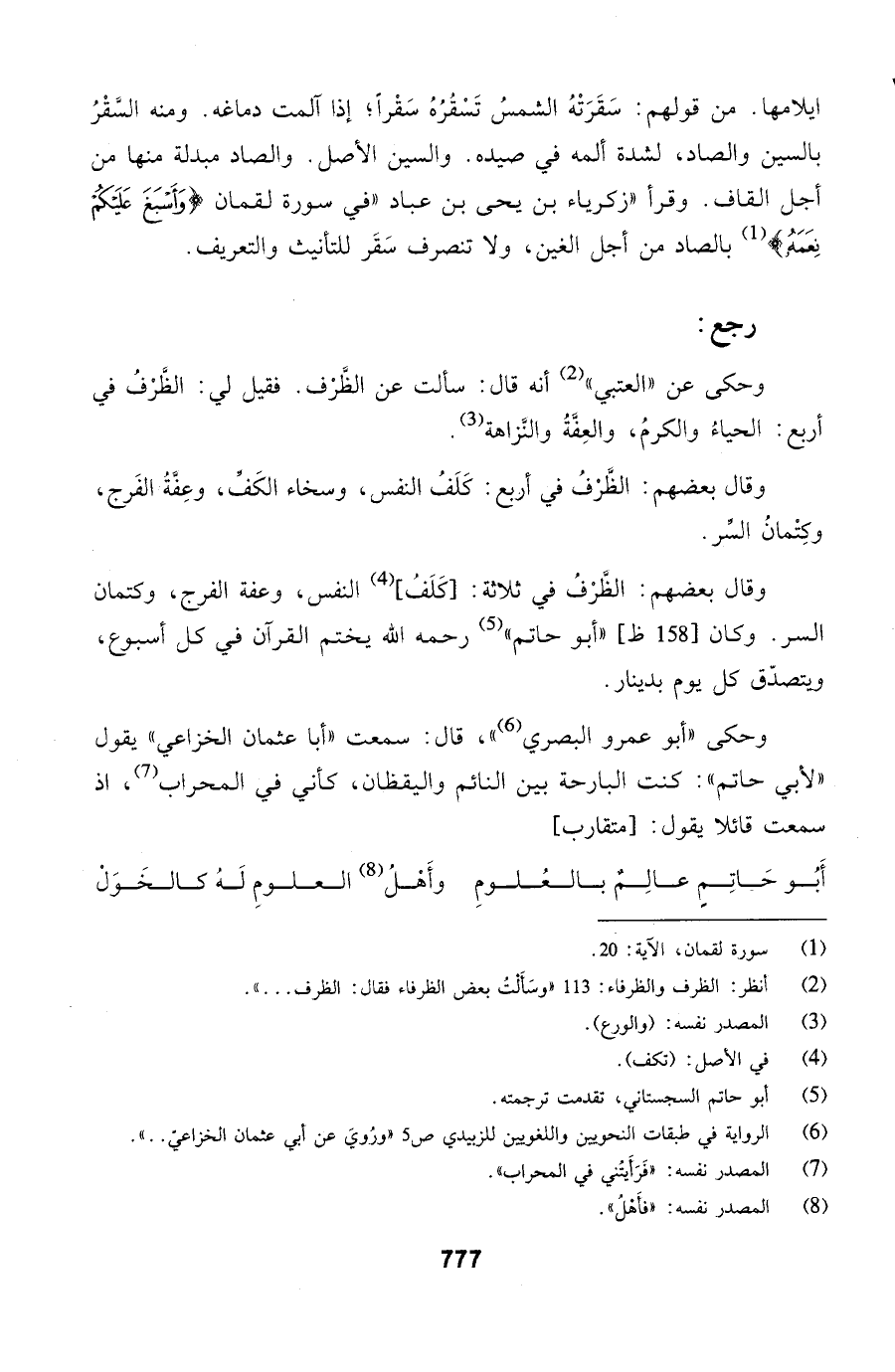 وقال بعضهم: الظَّرْفُ في ثلاثة: كَلَفُ النفس، وعفة الفرج، وكتمان السر. وكان أبو حاتم رحمه الله